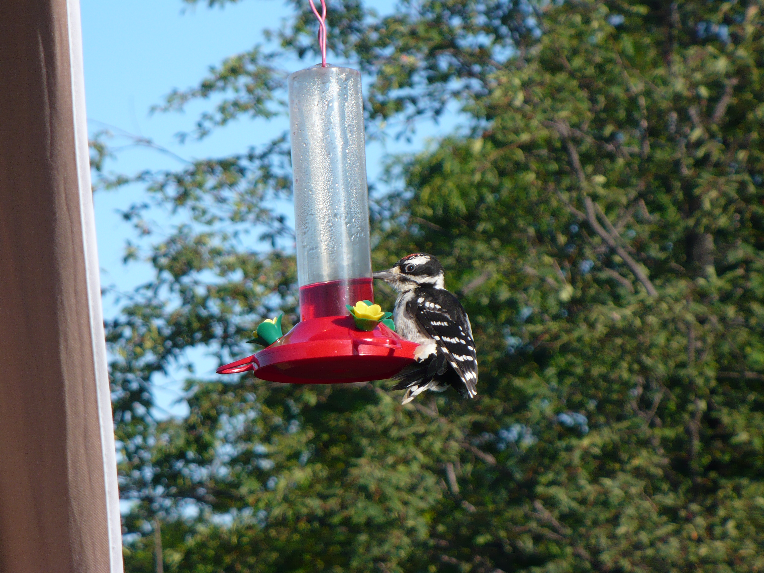 A mixed up hairy woodpecker visited them all and decided he really needed a sugar fix.  Somehow he managed to hold on to the perch and suck down nectar.